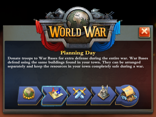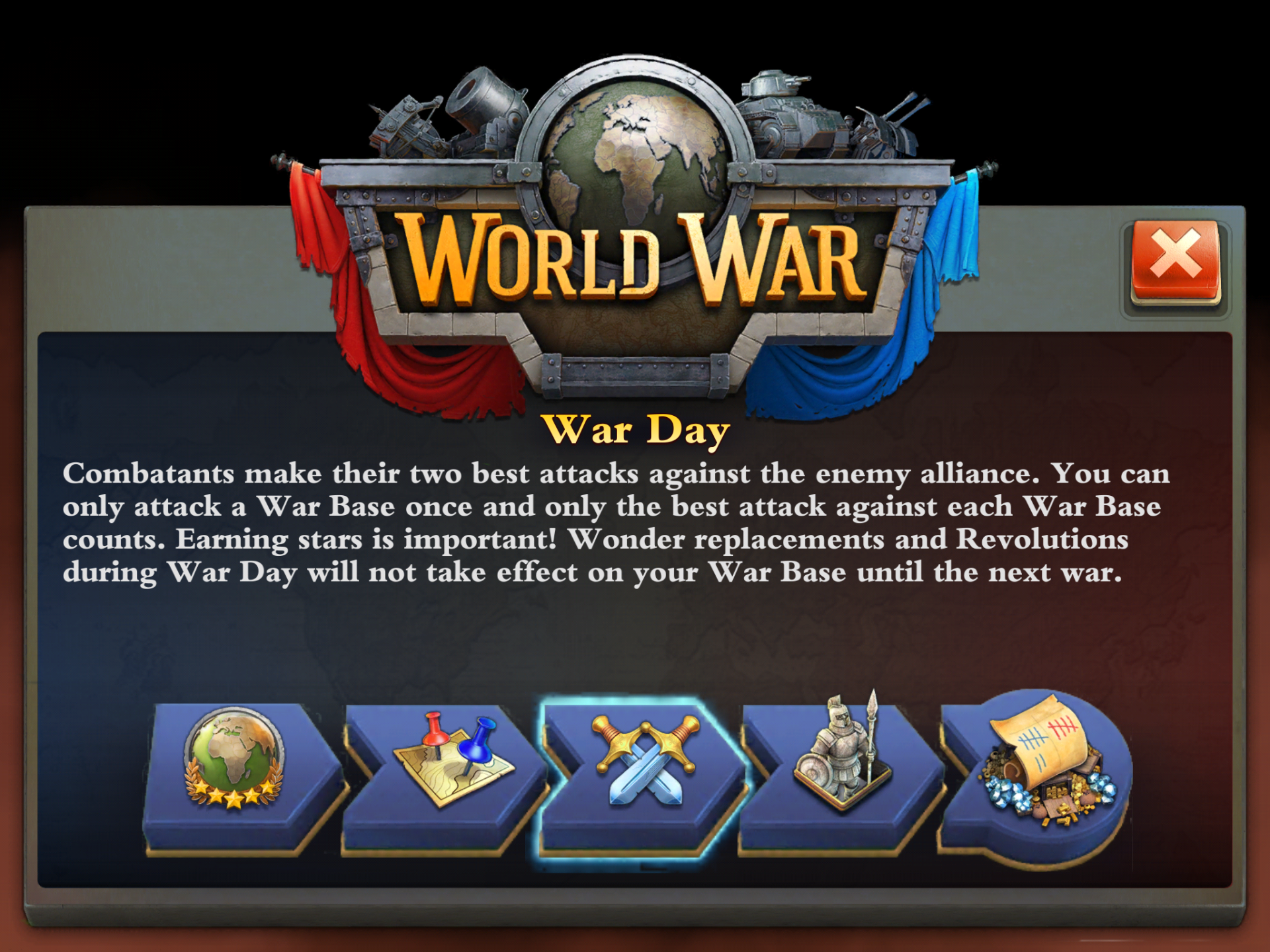 Hráči majú k dispozícii 2 útoky.Na konkrétneho nepriateľskúho hráča viete zaútočiť iba raz.Len najlepší útok na daného nepriaťeľa sa započítava. Je dôležité získať medaile.Nahradzovanie Divu sveta , revolúcia a úprava war bázy sa prejavia až po skončení aktuálnej vojny.