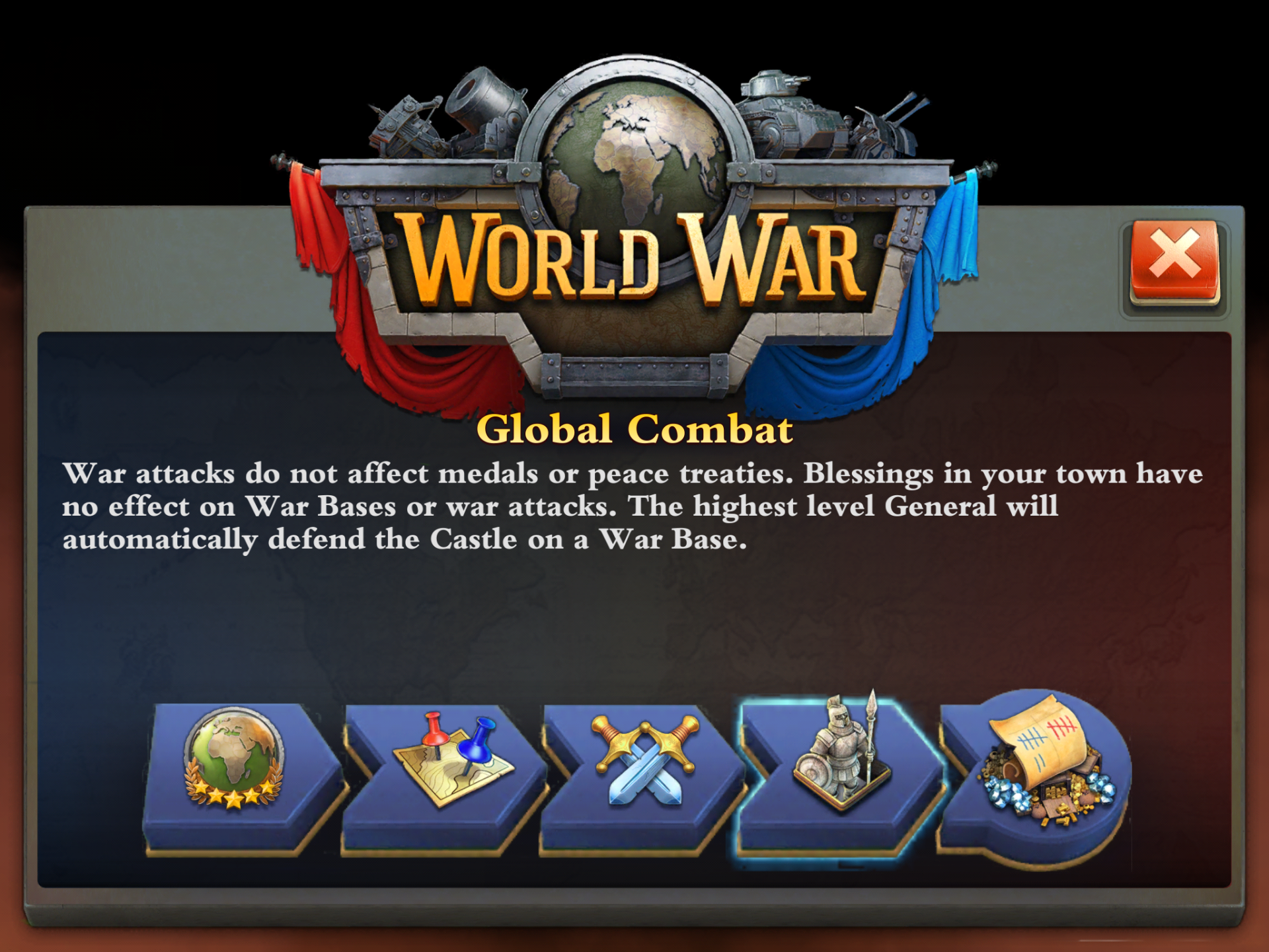 Útoky vo vojne nemajú efekt na medaile alebo mierové zmluvy. Blessing ( požehnania ) v meste nemajú žiadny efekt na war základňu alebo war útoky/obranu.Najsilnejší generál automaticky bráni zámok ( castle ) vo war základni. Pokiaľ útočíte , nechávate si loot ihneď po bitke( pripočíta sa ihneď do mestkej základne ) ale pri útokoch na Vás Vvo war Vám žiadne suroviny nikde v hre neodpočíta.