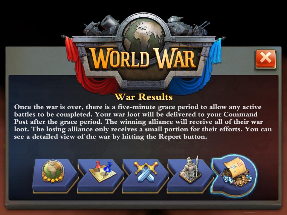 Keď sa čas vojny ukončí, nasleduje ešte 5 minútový odpočet na ukončenie všetkých aktívnych bitiek. Následne bude War loot prenesený do command centra v meste. Víťazná aliancia dostane celý war loot. Aliancia, ktorá prehraje, dostane malú časť lootu za jej úsilie. Môžete si pozrieť detailnú históriu priebehu poslednej / aktuálnej vojny stlačením tlačidla war detail report.
