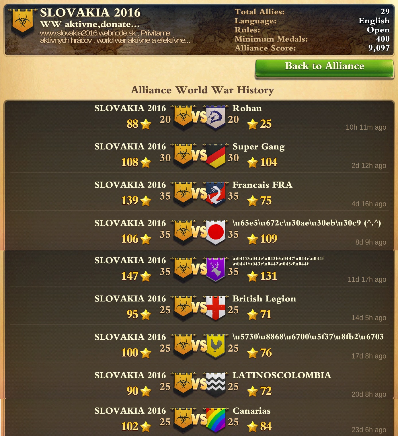 Útočte vo WW ( World War ) na súpera podľa hlavného pravidla a primeraného sebe, dôležité je víťazstvo, neútočte na zbytočne silného nepriateľa,na ktorého evidentne nemáte.Prehráte a nezískate žiadnu hviezdu pre alianciu, ani loot pre seba, keď prehráme. Kto sa nechce účastniť WW, odškrtnite si políčko WAR! v aliančnej bráne.